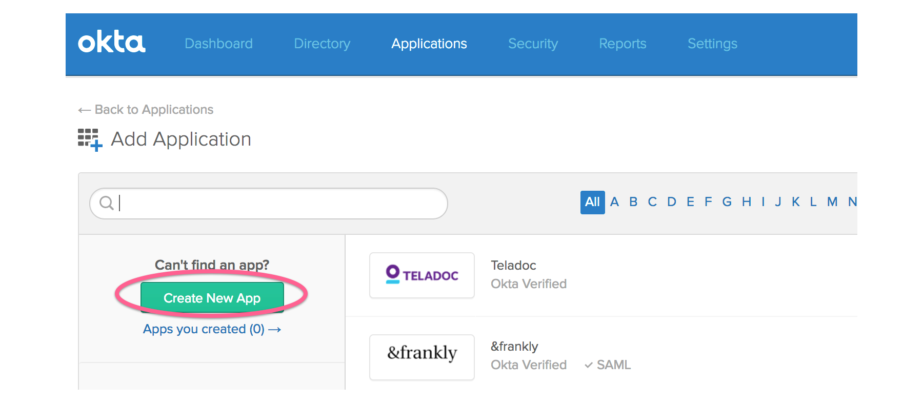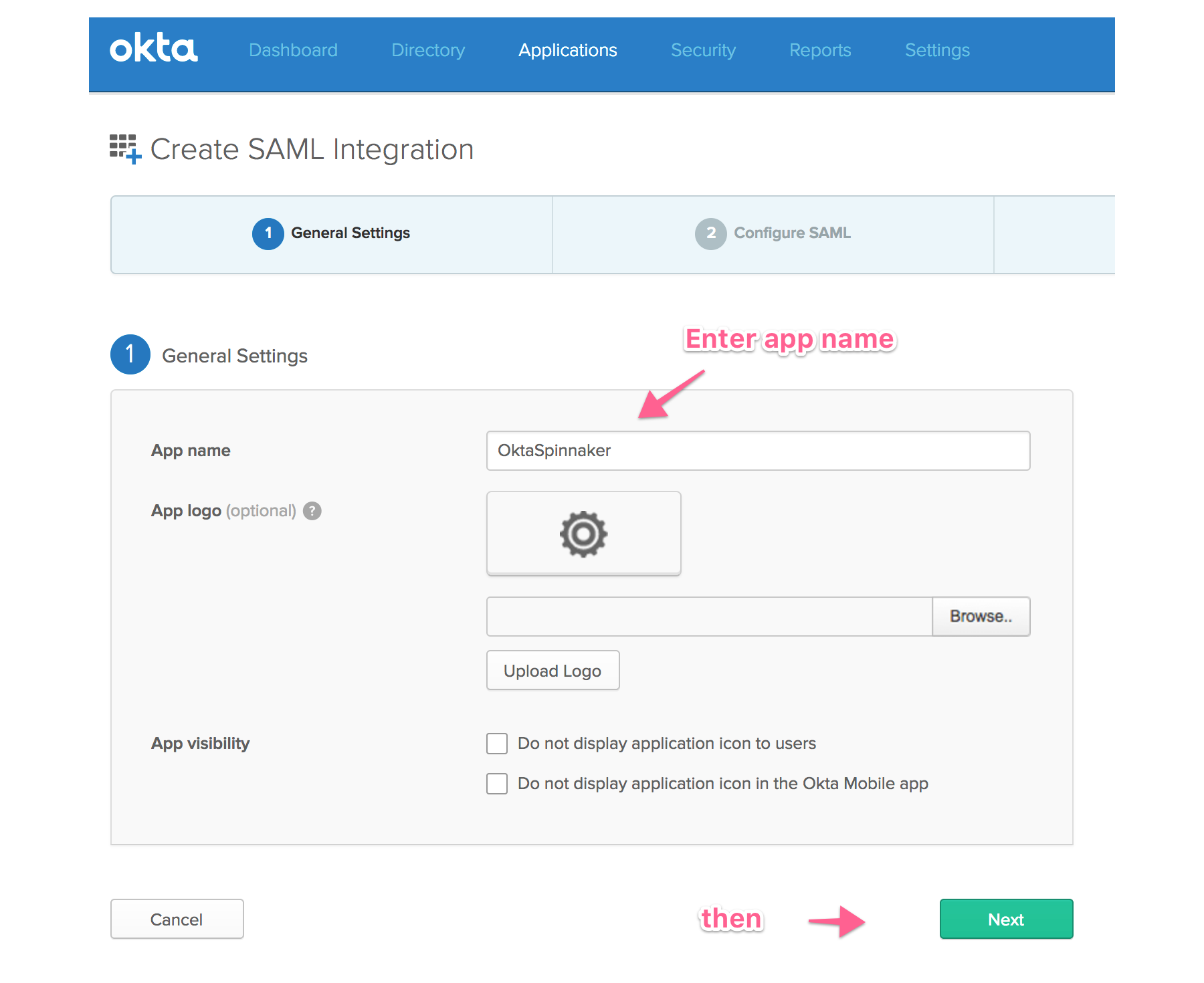 On the Create SAML Integration screen, enter an app name and click the Next button.