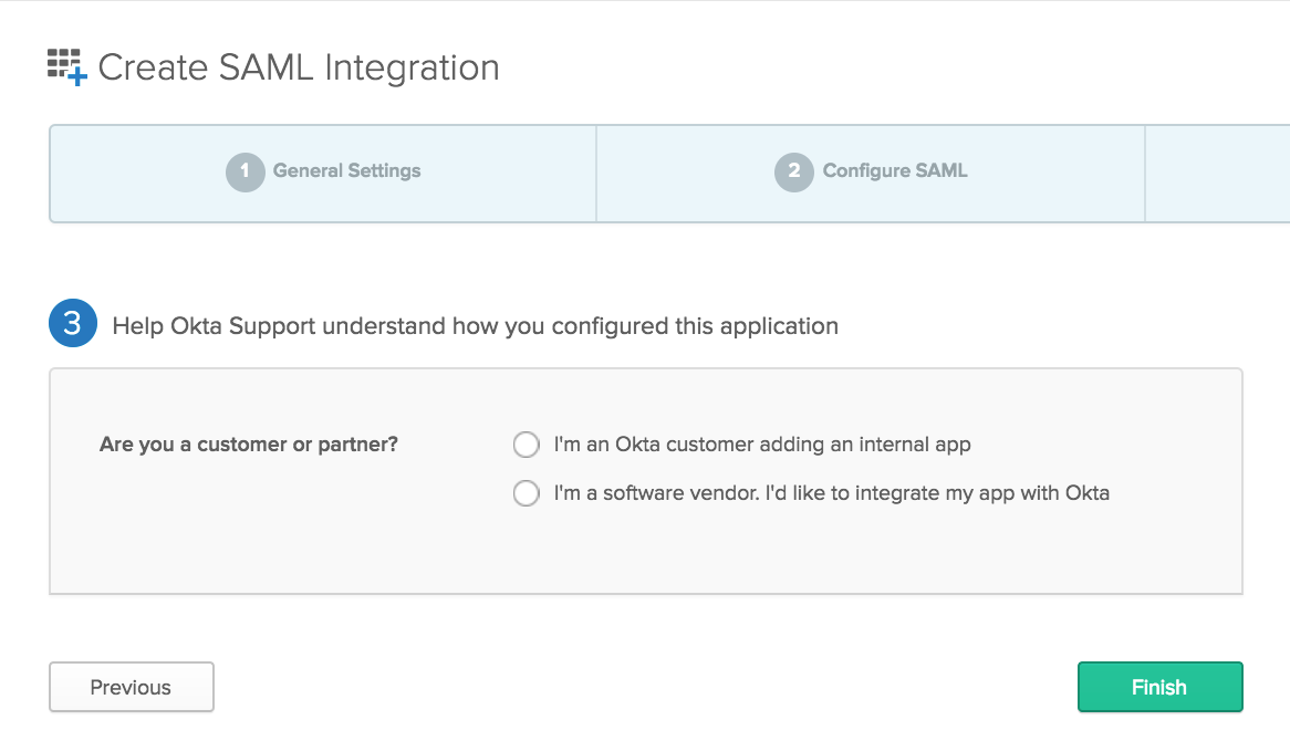 On the Create SAML Integration screen, select I’m an Okta customer adding an internal app and then click the Finish button.