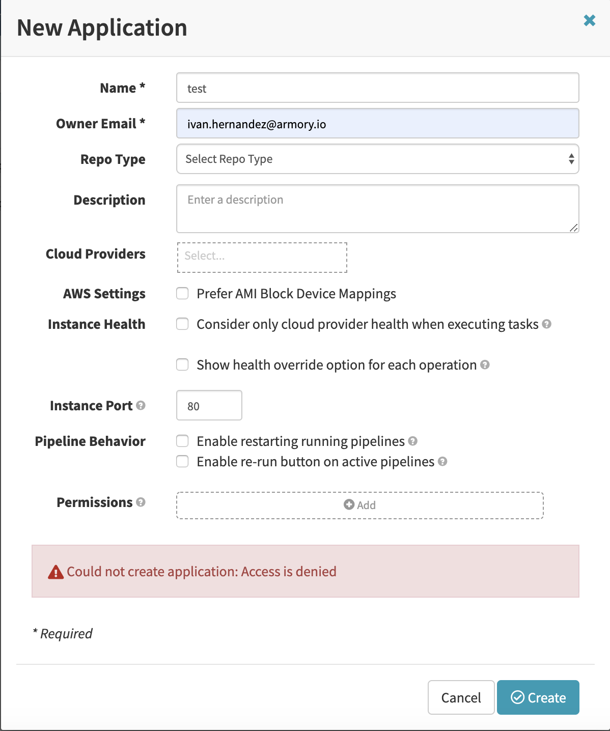 The following screenshot shows what happens when a user without sufficient permissions attempts to create an application in Deck, Spinnaker’s UI: