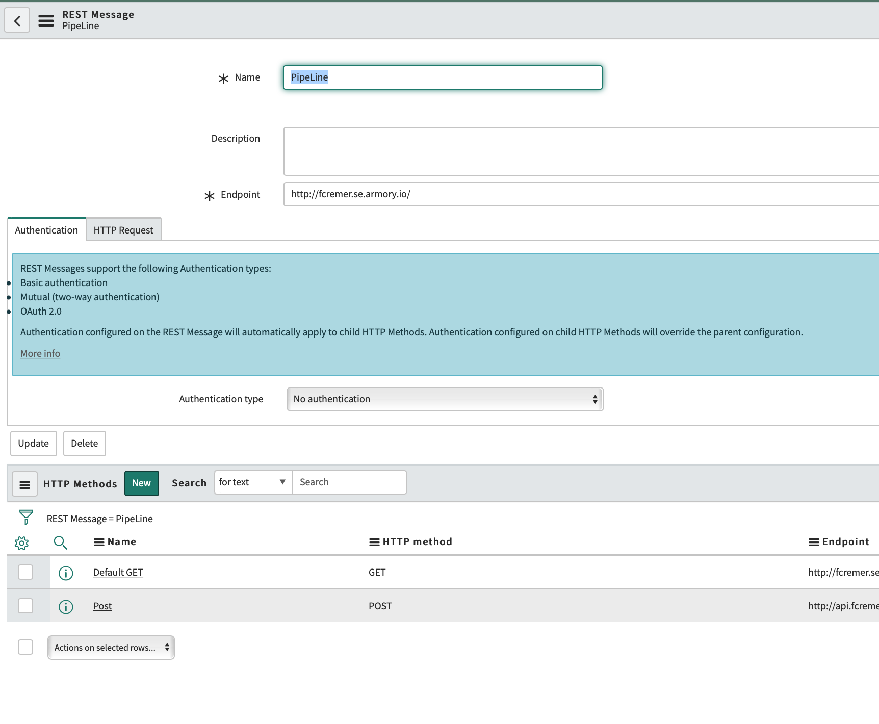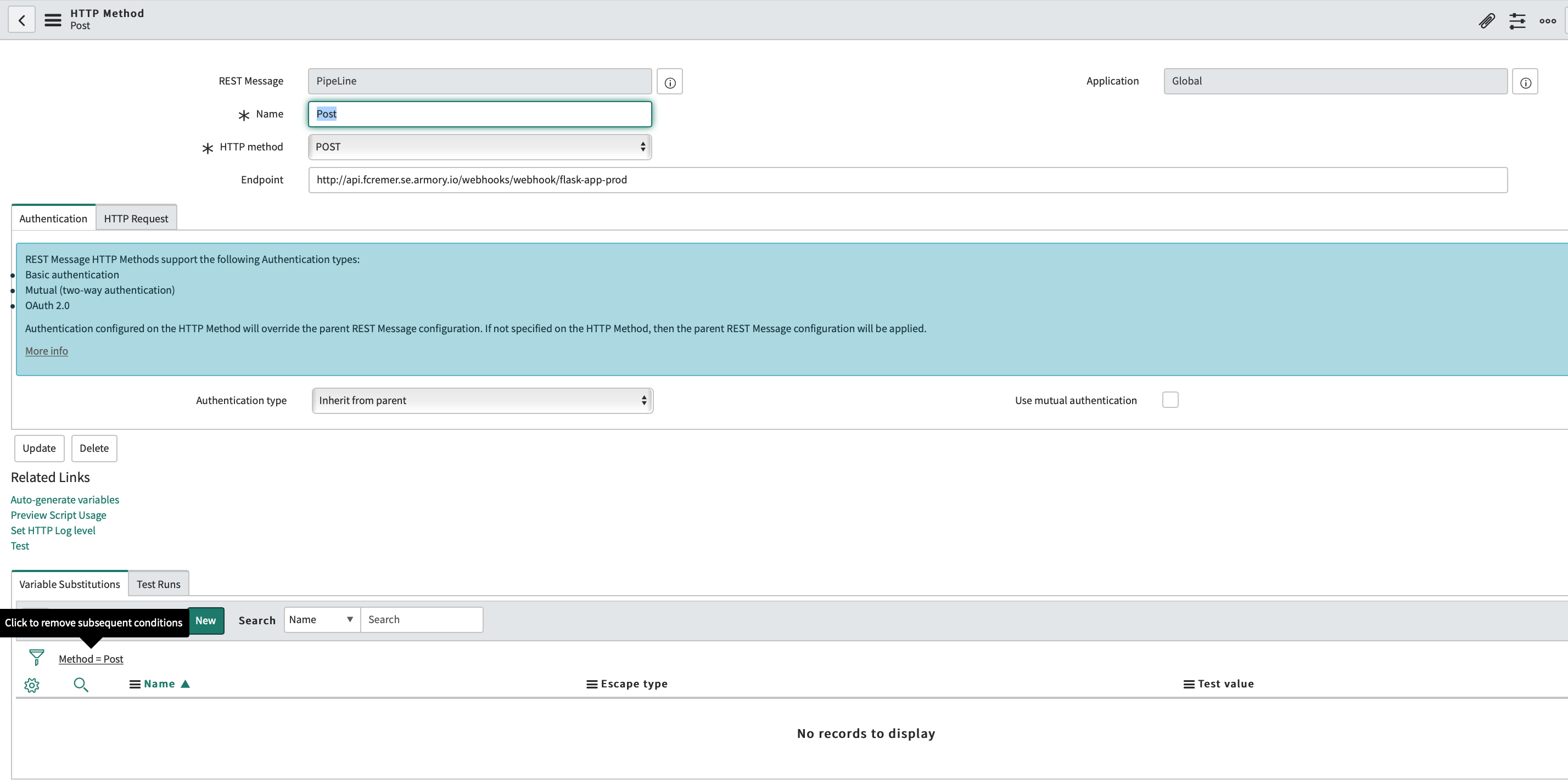 You can create multiple Resources, each with its own specific URL and script to do something. In this example, the “SpinnakerWebhookListener” is the Scripted REST API that handles all the various calls that Spinnaker makes to this specific ServiceNow Instance. You define Resources to handle each specific call. For example, you may want to create separate calls to create different type of tickets or perform different actions within ServiceNow.