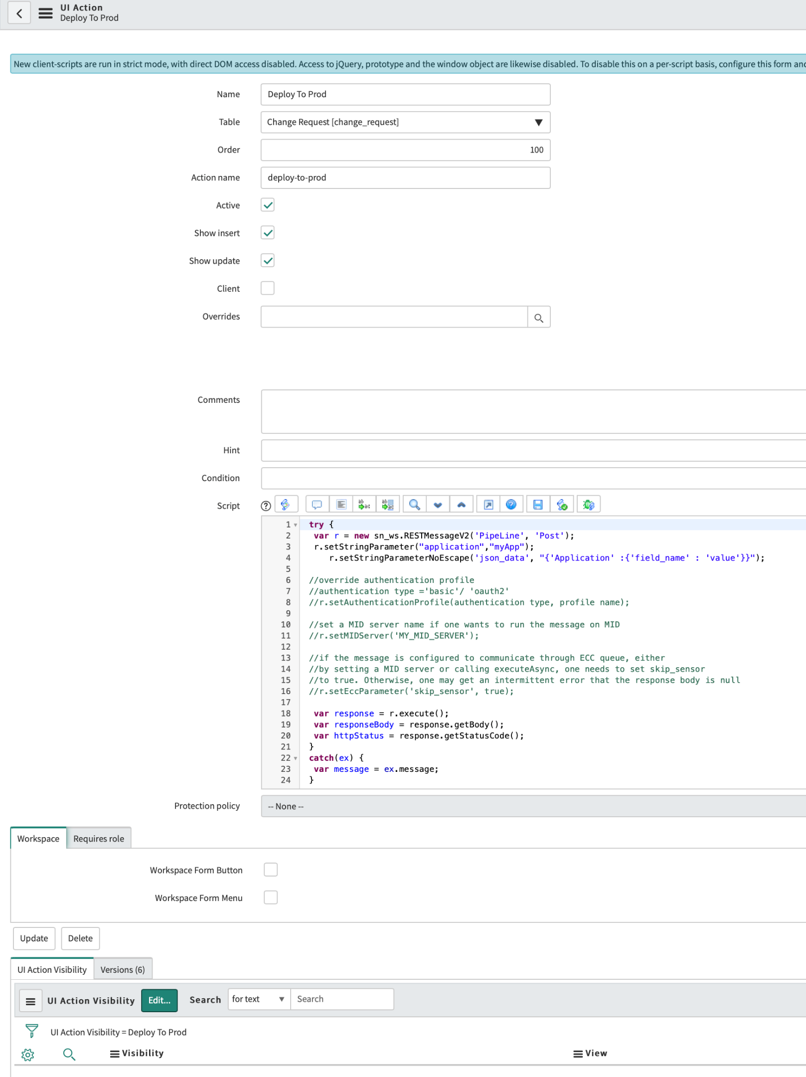 On the ServiceNow side, you need something to call this URL. In the example environment, there is a button on the Change Request form in ServiceNow that calls the URL.