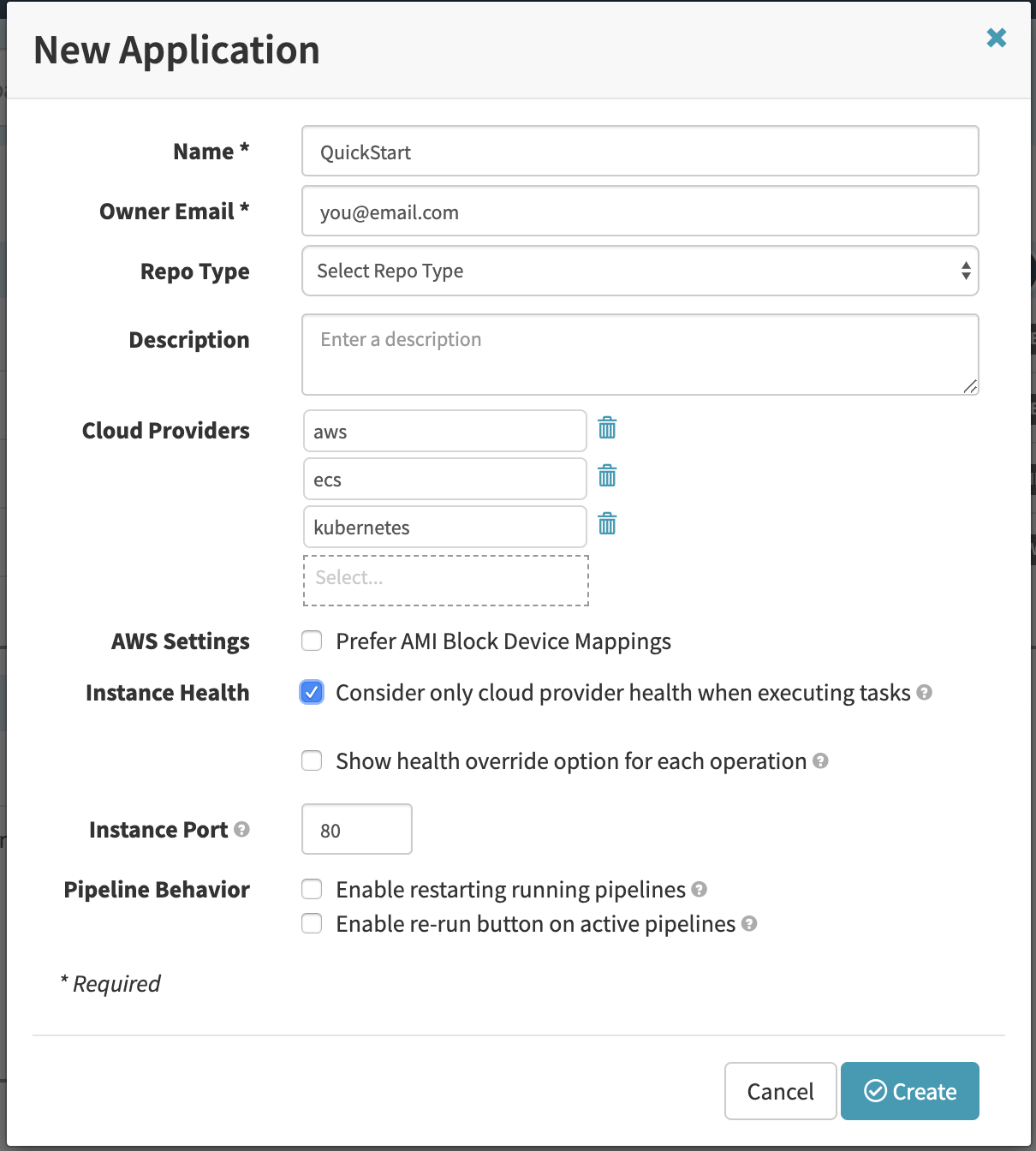 1. Go into Application QuickStart and create your first pipeline. This pipeline will deploy to an EC2 instance.
