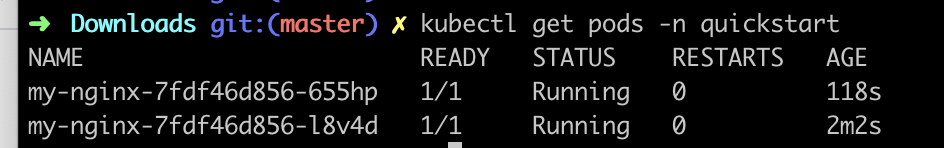 1. In EKS run the following commands to see nginx pods being created: kubectl get pods -n quickstart.