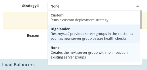 It’s important to set up the correct Deploy Strategy for your use case. Use the Highlander strategy for this example, which will ensure that only one server group for your application exists at a time.