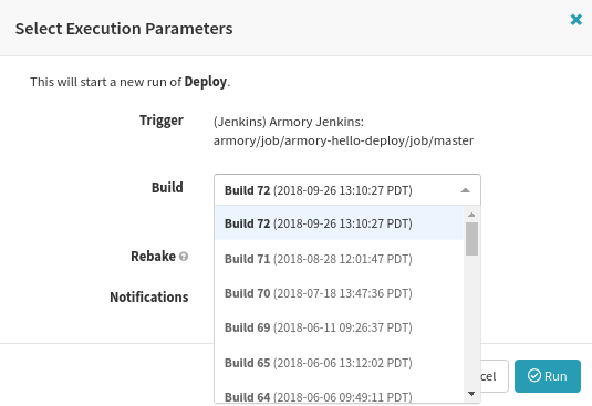 You will be able to select a Build for your Jenkins job from a drop down menu. By default, Spinnaker will not recreate an AMI unless the underlying package has changed. If you would like to force it, you may use the checkbox for “Rebake”.